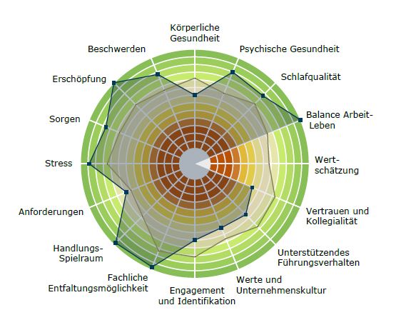 Natürlich fragen wir auch genau, wie Sie Ihre Arbeit sehen. Was Sie dort unterstützt, wie Sie die Anforderungen beurteilen. Ob Sie das alles zusammen genommen stresst, erschöpft oder Schmerzen verursacht.